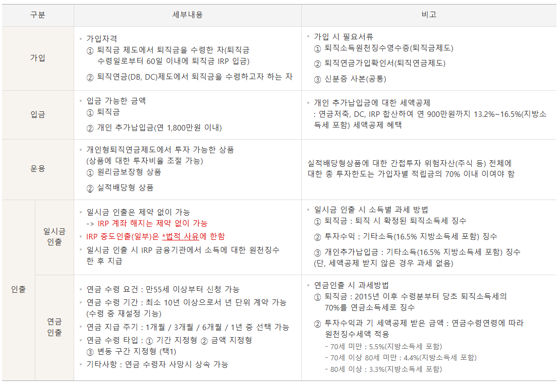 다만 IRP를 운용할 때는 몇 가지 유의할 점이 있습니다. 연금저축과 IRP의 세액공제 한도는 합산 기준으로 연 900만 원을 넘길 수 없으며, 위험자산(펀드·ETF 등)은 전체 자산의 70% 이내로만 편입할 수 있습니다. 또한 IRP는 원칙적으로 만 55세 이전에는 인출이 제한되며, 중도 해지 시 세액공제 혜택이 환수되는 등 불이익이 발생할 수 있습니다.